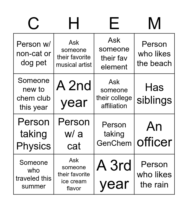 This bingo card has 25 words: Someone not majoring in Chem, A person who knows multiple languages, Has siblings, Has a tattoo/piercing, Someone new to chem club this year, Person w/ non-cat or dog pet, A 2nd year, Ask someone their favorite musical artist, Ask someone their favorite ice cream flavor, Someone in one of your classes, Person taking Physics, Person taking GenChem, Someone wearing blue, Has attended chem club before this year, Ask someone their college affiliation, Ask someone their fav color, A 3rd year, Ask someone their fav element, Person w/ a cat, An officer, Someone who traveled this summer, Someone in a lab, Person who likes the rain, Person who likes the beach and Ask someone what they would major in if not STEM subject.