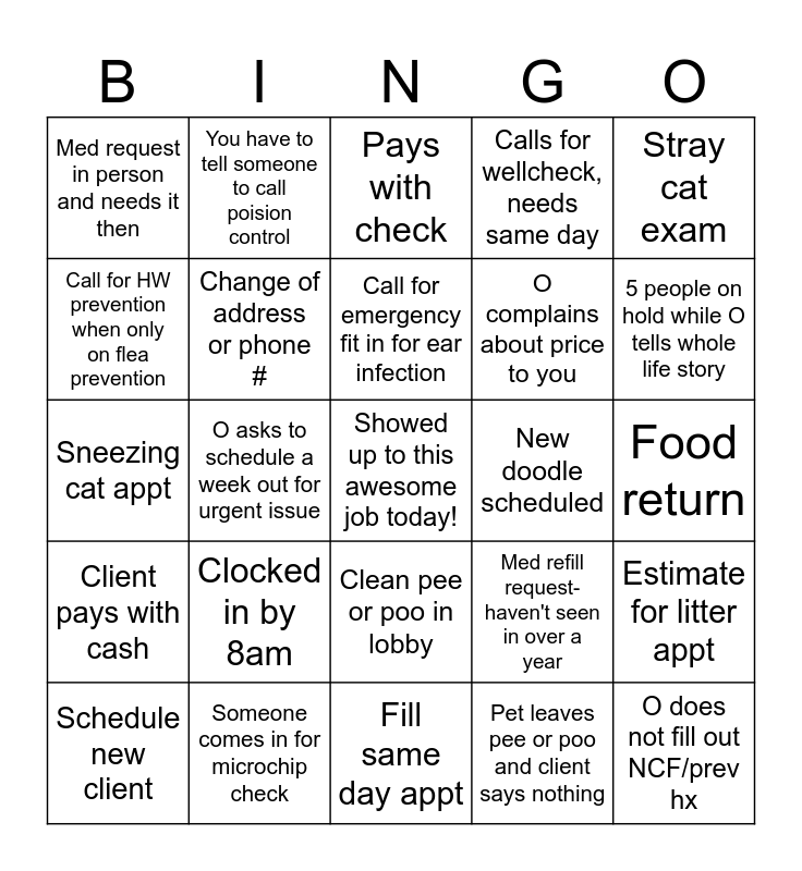 This bingo card has a free space and 24 words: Clocked in by 8am, Someone comes in for microchip check, Call for emergency fit in for ear infection, Schedule new client, Stray cat exam, Med request in person and needs it then, Call for HW prevention when only on flea prevention, You have to tell someone to call poision control, New doodle scheduled, Clean pee or poo in lobby, O complains about price to you, Sneezing cat appt, Med refill request-haven't seen in over a year, Estimate for litter appt, Change of address or phone #, Pet leaves pee or poo and client says nothing, Food return, Pays with check, 5 people on hold while O tells whole life story, O asks to schedule a week out for urgent issue, O does not fill out NCF/prev hx, Client pays with cash, Calls for wellcheck, needs same day and Fill same day appt.