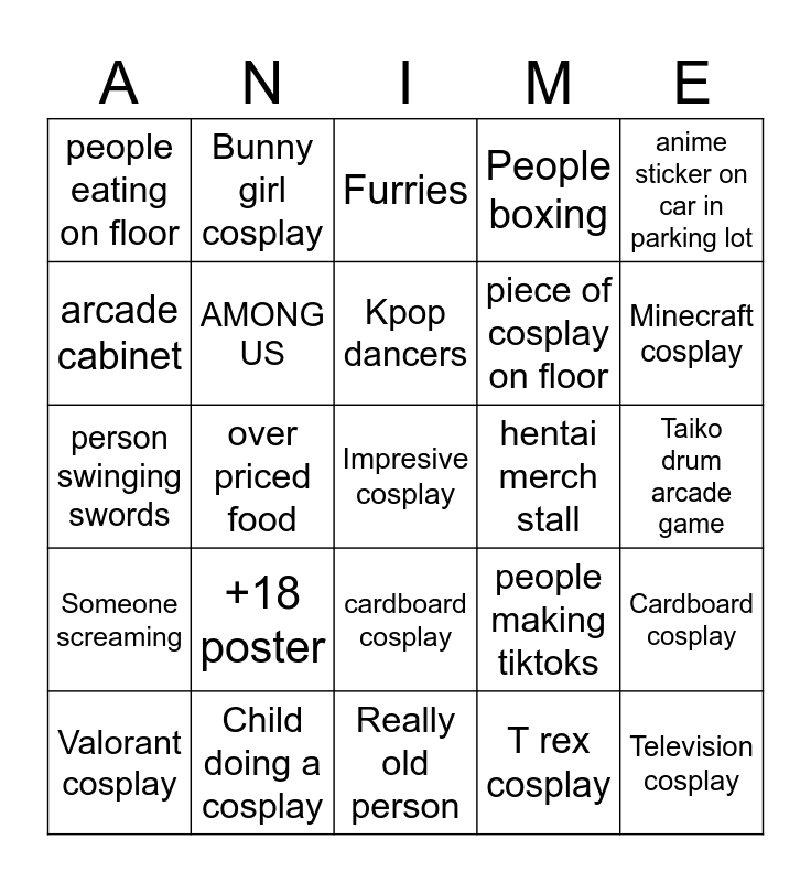 This bingo card has a free space and 24 words: +18 poster, Child doing a cosplay, Kpop dancers, Valorant cosplay, anime sticker on car in parking lot, people eating on floor, arcade cabinet, Bunny girl cosplay, hentai merch stall, cardboard cosplay, piece of cosplay on floor, person swinging swords, people making tiktoks, Cardboard cosplay, AMONG US, T rex cosplay, Taiko drum arcade game, Furries, Minecraft cosplay, over priced food, Television cosplay, Someone screaming, People boxing and Really old person.