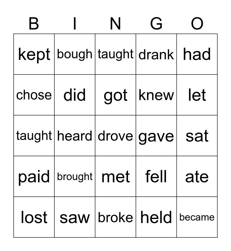 This bingo card has a free space and 48 words: was/were, became, began, broke, brought, built, bough, caught, chose, came, did, drank, ate, fell, felt, found, got, gave, went, had, heard, held, kept, knew, left, let, lost, made, met, paid, put, read, ran, said, saw, sold, sent, sat, slept, spoke, stood, took, taught, told, taught, understood, wore and wrote.
