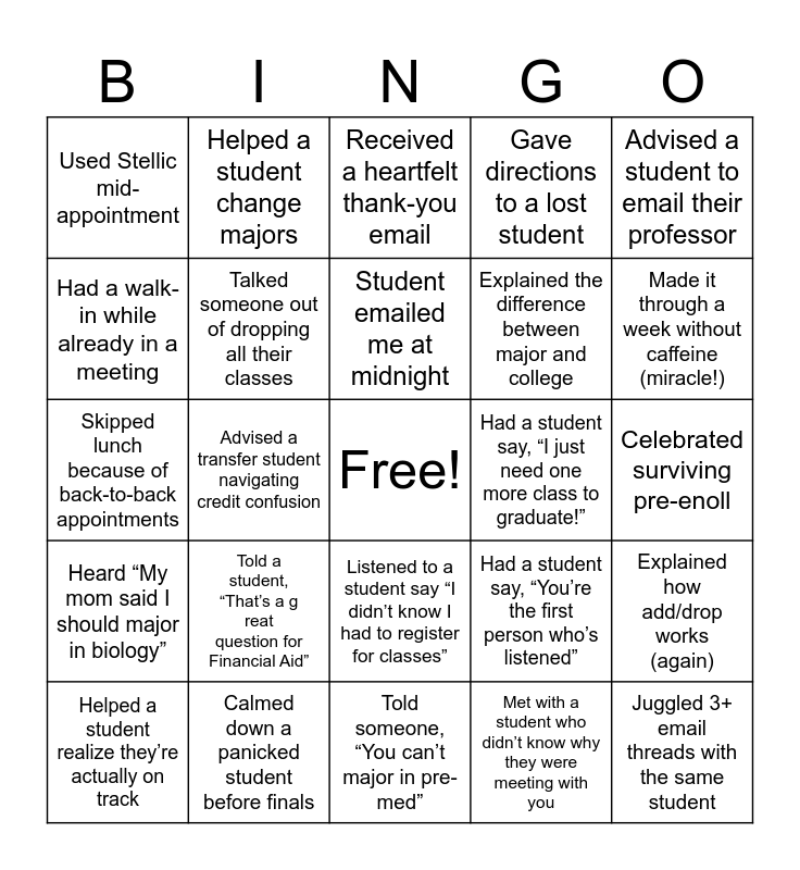 This bingo card has a free space and 24 words: Told a student, “That’s a great question for Financial Aid”, Calmed down a panicked student before finals, Student emailed me at midnight, Helped a student realize they’re actually on track, Advised a student to email their professor, Used Stellic mid-appointment, Had a walk-in while already in a meeting, Helped a student change majors, Had a student say, “I just need one more class to graduate!”, Listened to a student say “I didn’t know I had to register for classes”, Explained the difference between major and college, Skipped lunch because of back-to-back appointments, Had a student say, “You’re the first person who’s listened”, Explained how add/drop works (again), Talked someone out of dropping all their classes, Met with a student who didn’t know why they were meeting with you, Celebrated surviving pre-enoll, Received a heartfelt thank-you email, Made it through a week without caffeine (miracle!), Advised a transfer student navigating credit confusion, Juggled 3+ email threads with the same student, Heard “My mom said I should major in biology”, Gave directions to a lost student and Told someone, “You can’t major in pre-med”.