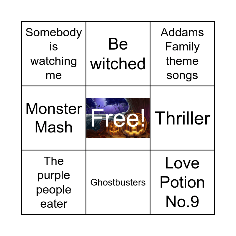 This bingo card has a free space and 8 words: Thriller, Addams Family theme songs, Be witched, The purple people eater, Somebody is watching me, Love Potion No.9, Monster Mash and Ghostbusters.