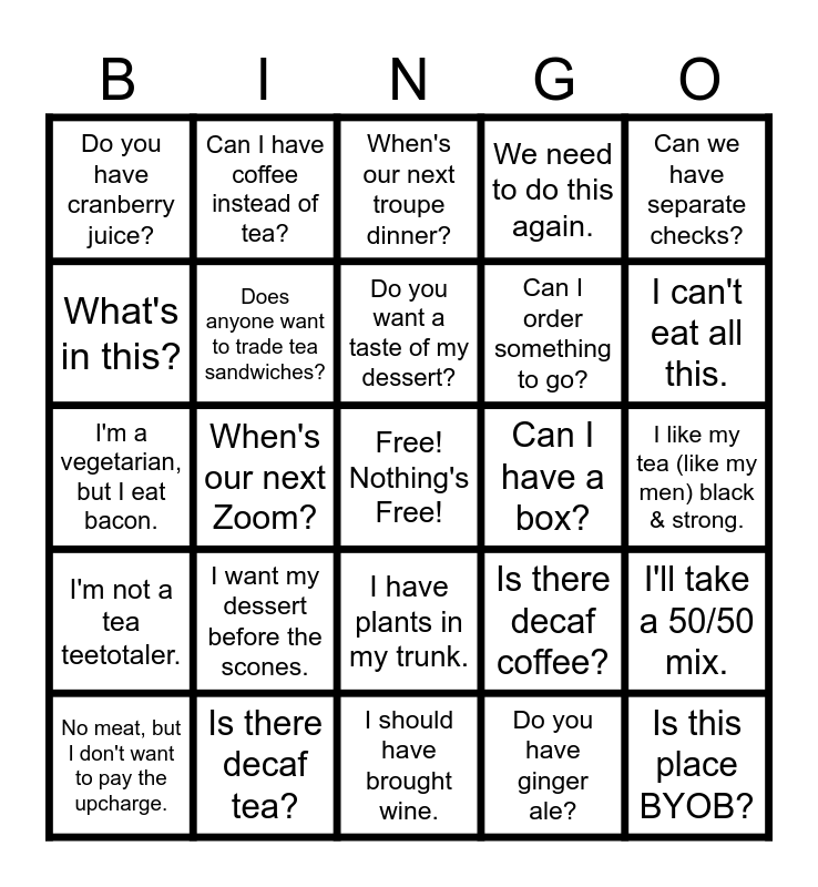 This bingo card has a free space and 24 words: I want my dessert before the scones., Is there decaf tea?, Do you want a taste of my dessert?, No meat, but I don't want to pay the upcharge., Can we have separate checks?, Do you have cranberry juice?, What's in this?, Can I have coffee instead of tea?, Can I have a box?, I have plants in my trunk., Can I order something to go?, I'm a vegetarian, but I eat bacon., Is there decaf coffee?, I'll take a 50/50 mix., Does anyone want to trade tea sandwiches?, Do you have ginger ale?, I like my tea (like my men) black & strong., When's our next troupe dinner?, I can't eat all this., When's our next Zoom?, Is this place BYOB?, I'm not a tea teetotaler., We need to do this again. and I should have brought wine..