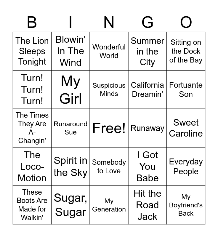 This bingo card has a free space and 35 words: Oh, Pretty Woman, Brown Eyed Girl, Mrs. Robinson, My Girl, Somebody to Love, Summer in the City, Turn! Turn! Turn!, Get Together, Suspicious Minds, Ain't No Mountain High Enough, The Times They Are A-Changin', Sitting on the Dock of the Bay, Stand By Me, Hang On Sloopy, The Lion Sleeps Tonight, Runaway, Hit the Road Jack, Runaround Sue, The Loco-Motion, My Boyfriend's Back, I Got You Babe, These Boots Are Made for Walkin', Everyday People, Sugar, Sugar, Wonderful World, Fortuante Son, Respect, All Along the Watchtower, California Dreamin', Sweet Caroline, Born to Be Wild, My Generation, Spirit in the Sky, Blowin' In The Wind and Piece of My Heart.