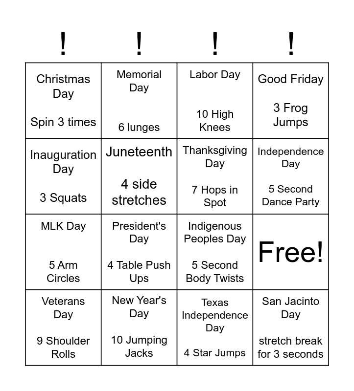 This bingo card has 16 words: New Year's Day 10 Jumping Jacks, Free!, Labor Day 10 High Knees, Christmas Day Spin 3 times, MLK Day 5 Arm Circles, Memorial Day 6 lunges, Indigenous Peoples Day 5 Second Body Twists, Texas Independence Day 4 Star Jumps, Inauguration Day 3 Squats, Juneteenth 4 side stretches, Veterans Day 9 Shoulder Rolls, Good Friday 3 Frog Jumps, President's Day 4 Table Push Ups, Independence Day 5 Second Dance Party, Thanksgiving Day 7 Hops in Spot and San Jacinto Day stretch break for 3 seconds.