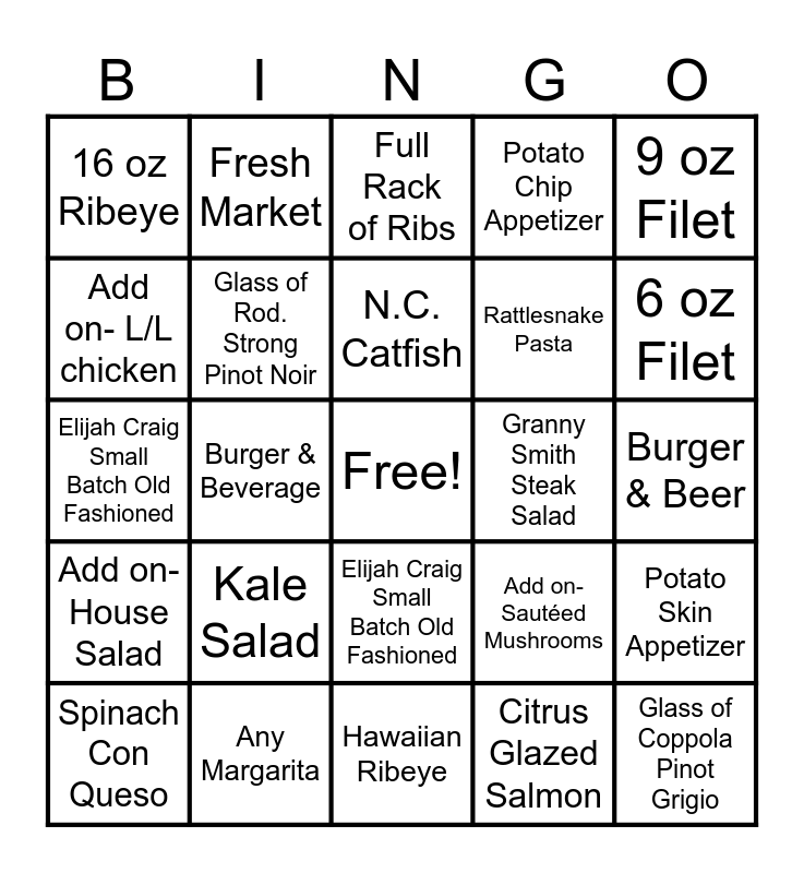 This bingo card has a free space and 24 words: Kale Salad, Any Margarita, N.C. Catfish, Spinach Con Queso, 9 oz Filet, 16 oz Ribeye, Add on- L/L chicken, Fresh Market, Granny Smith Steak Salad, Elijah Craig Small Batch Old Fashioned, Rattlesnake Pasta, Elijah Craig Small Batch Old Fashioned, Add on- Sautéed Mushrooms, Potato Skin Appetizer, Glass of Rod. Strong Pinot Noir, Citrus Glazed Salmon, Burger & Beer, Full Rack of Ribs, 6 oz Filet, Burger & Beverage, Glass of Coppola Pinot Grigio, Add on- House Salad, Potato Chip Appetizer and Hawaiian Ribeye.