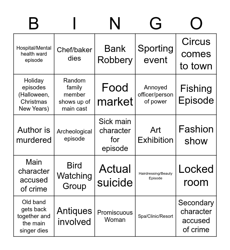 This bingo card has 62 words: TV show/film is being shot, Antiques involved, Wine Vineyard/Distillery, Main character accused of crime, Secondary character accused of crime, Someone with connections to crime/past with crime, Random family member shows up of main cast, Some sort of rich person, Annoyed officer/person of power, Cricket, Sporting event, Cold case reopened, Holiday episodes (Halloween, Christmas New Years), Cooking episode/bake off, Cult/Weird religion, Hospital/Mental health ward episode, Sick main character for episode, Circus comes to town, Person gets poisoned, Food market, Art Exhibition, Bank Robbery, Old band gets back together and the main singer dies, Spa/Clinic/Resort, Super bad weather, Wedding Party, Prisoner Killed in Custody, Buried Treasure Found, Locked room, Body found in water, Someone lying about their identity, Murder committed in front of main character, Apparent suicide, Local society involved, Fashion show, Chef/baker dies, Character is connected to suspect or deceased, Blind witness?, Archeological episode, Skydiving, Author is murdered, Radio Show, Bird Watching Group, Fortune Teller involved, Fishing Episode, Hairdressing/Beauty Episode, Supernatural Episode, Bikers, Jane/John Doe, Detectives meeting each other/passing the torch, Actual suicide, Promiscuous Woman, Abusive Husband/Boyfriend, Secretly Queer Character, Openly Queer Character, Cover Up/Inside Job, Multiple Deaths, Flashback, Wig, Book Event, Swimming Pool Death and Character With An Accent.