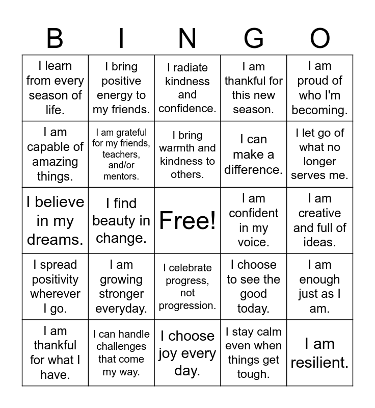This bingo card has a free space and 24 words: I am growing stronger everyday., I can handle challenges that come my way., I bring warmth and kindness to others., I am thankful for what I have., I am proud of who I'm becoming., I learn from every season of life., I am capable of amazing things., I bring positive energy to my friends., I am confident in my voice., I celebrate progress, not progression., I can make a difference., I believe in my dreams., I choose to see the good today., I am enough just as I am., I am grateful for my friends, teachers, and/or mentors., I stay calm even when things get tough., I am creative and full of ideas., I radiate kindness and confidence., I let go of what no longer serves me., I find beauty in change., I am resilient., I spread positivity wherever I go., I am thankful for this new season. and I choose joy every day..