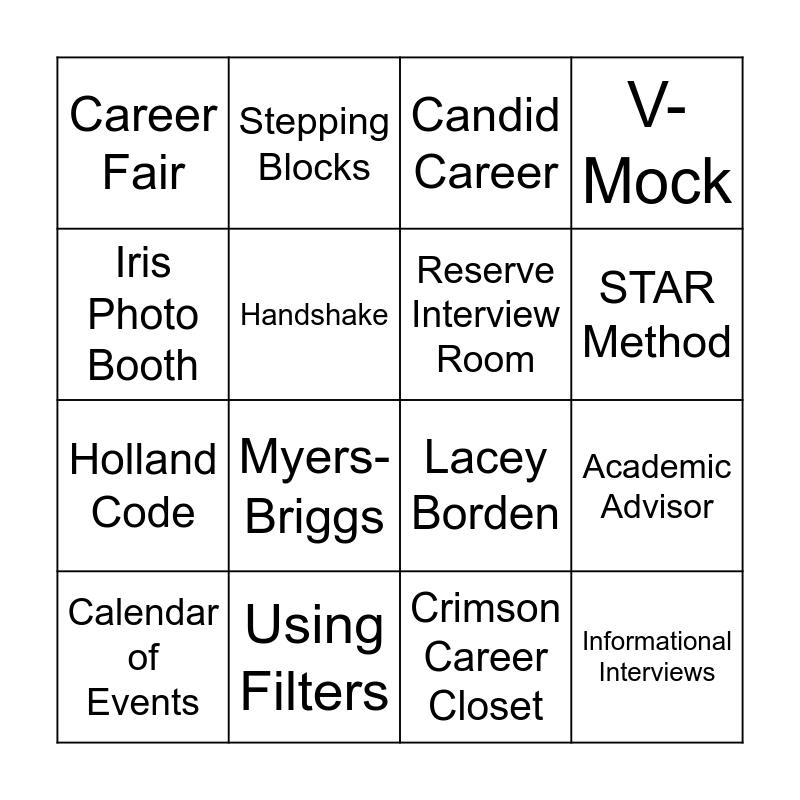 This bingo card has 16 words: Using Filters, Academic Advisor, Candid Career, Career Fair, Holland Code, Stepping Blocks, Lacey Borden, Crimson Career Closet, Iris Photo Booth, Handshake, Calendar of Events, V-Mock, Myers-Briggs, STAR Method, Reserve Interview Room and Informational Interviews.