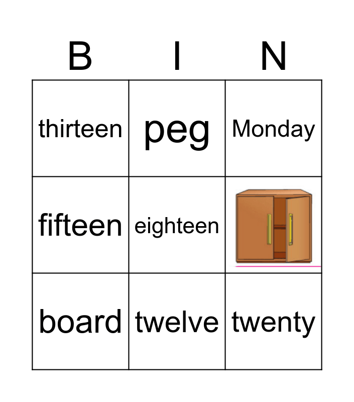 This bingo card has 7 images and 14 words: picture, peg, classroom, board, thirteen, Monday, twelve, twenty, fifteen, table, cupboard, CD player, eighteen and computer.