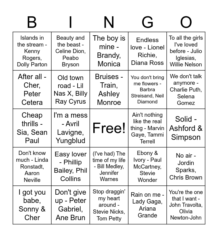 This bingo card has a free space and 54 words: We've got tonight - Kenny Rogers, Sheena Easton, Don't know much - Linda Ronstadt, Aaron Neville, Separate Lives - Phil Collins, Marilyn Martin, Almost Paradise - Mike Reno, Ann Wilson, (I've had) The time of my life - Bill Medley, Jennifer Warnes, Up where we belong - Joe Cocker, Jennifer Warnes, Endless love - Lionel Richie, Diana Ross, The next time I fall - Peter Cetera, Amy Grant, After all - Cher, Peter Cetera, Leather and lace - Stevie Nicks, Don Henley, Islands in the stream - Kenny Rogers, Dolly Parton, Just give me a reason - Pink, Nate Ruess, Don't give up - Peter Gabriel, Ane Brun, I got you babe, Sonny & Cher, I knew you were waiting - George Michael, Aretha Franklin, Stop draggin' my heart around - Stevie Nicks, Tom Petty, You're the one that I want - John Travolta, Olivia Newton-John, You don't bring me flowers - Barbra Streisand, Neil Diamond, Don't go breaking my heart - Elton John, Kiki Dee, Solid - Ashford & Simpson, Ebony & Ivory - Paul McCartney, Stevie Wonder, Under Pressure - Queen, David Bowie, Ain't nothing like the real thing - Marvin Gaye, Tammi Terrell, To all the girls I've loved before - Julio Iglesias, Willie Nelson, Shallow - Lady Gaga, Bradley Cooper, Beauty and the beast - Celine Dion, Peabo Bryson, A whole new world - Peabo Bryson, Regina Belle, Somewhere out there - Linda Ronstadt, James Ingram, American Boy - Estelle, Kanye West, Rain on me - Lady Gaga, Ariana Grande, Never gonna let you go - Sergio Mendes, Cynthia Weil, Senorita - Shawn Mendes, Camila Cabello, Telephone - Lady Gaga, Beyonce, Promiscuous - Nelly Furtado, Timbaland, The boy is mine - Brandy, Monica, Rich Girl - Gwen Stefani, Eve, Cheap thrills - Sia, Sean Paul, No air - Jordin Sparks, Chris Brown, Hips don't lie - Shakira, Wyclef Jean, Old town road - Lil Nas X, Billy Ray Cyrus, APT.- ROSE, Bruno Mars, Dancing in the street - David Bowie, Mick Jagger, Say say say - Paul McCartney, Micheal Jackson, Would I lie to you? - Charles & Eddie, Easy lover - Phillip Bailey, Phil Collins, Guilty - Barbra Streisand, Barry Gibb, Stumblin' in - Suzi Quatro, Chris Norman, Despacito - Luis Fonzi, Daddy Yankee, Bruises - Train, Ashley Monroe, I'm a mess - Avril Lavigne, Yungblud, We don't talk anymore - Charlie Puth, Selena Gomez, California Gurls - Katy Perry, Snoop Dogg, Umbrella - Rhianna, JAY-Z and Timber - Pitbull, Kesha.