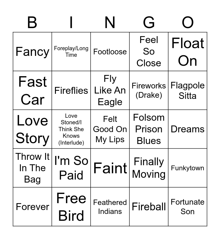 This bingo card has 59 words: Best of You, Free Bird, Dog Days Are Over, Throw It In The Bag, Fireball, Firework (Katy Perry), Fireflies, Fire Burning, Fireworks (Drake), Flashing Lights, Feel So Close, Feel Good Inc., Fast Car, Faith, Family Affair, Fancy, Felt Good On My Lips, Float On, Fly Away, Fly Like An Eagle, Folsom Prison Blues, Footloose, Forever, Funkytown, Fun, Fun, Fun, Free And Easy (Down The Road I Go), Free Your Mind, Fly, Flagpole Sitta, Fly Me To The Moon, Funny the Way It Is, Foxey Lady, All Right Now, For What It's Worth, Foreplay/Long Time, Grave, cardigan, Love Stoned/I Think She Knows (Interlude), Devil I've Been, Love Story, Adore You, I'm So Paid, Dreams, Do You Realize??, My Way, Thinkin' Bout You, Fade Yo Black, Fool in the Rain, Faint, Feathered Indians, Freak On a Leash, Fix You, Friday, Flowers, Flowers In Your Hair, Finally Moving, The Final Countdown, Fortunate Son and Fortune Faded.