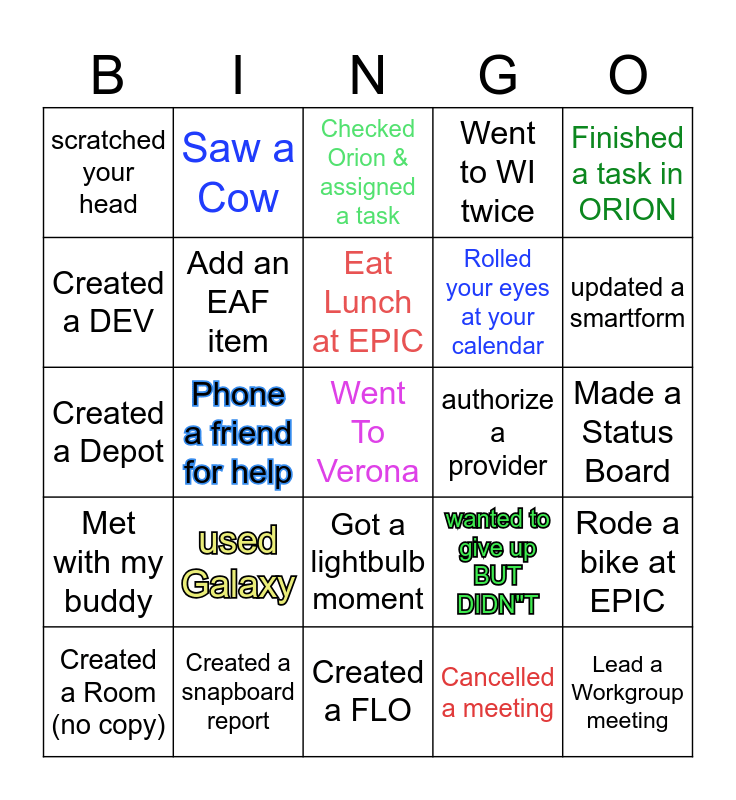 This bingo card has a free space and 29 words: Created a Room (no copy), worked with a TPA, Phone a friend for help, Created a Visit Type, scratched your head, Checked Orion & assigned a task, Add an EAF item, used Galaxy, authorize a provider, Created a snapboard report, Made a Status Board, Lead a Workgroup meeting, Created a FLO, Cancelled a meeting, updated a smartform, authorize a Staff member, Got a lightbulb moment, Met with my buddy, Finished a task in ORION, Created a Depot, wanted to give up BUT DIDN"T, Created a PLF, Rolled your eyes at your calendar, Created a DEV, Went to WI twice, Saw a Cow, Rode a bike at EPIC, Eat Lunch at EPIC and Saw Dark Vader at EPIC.