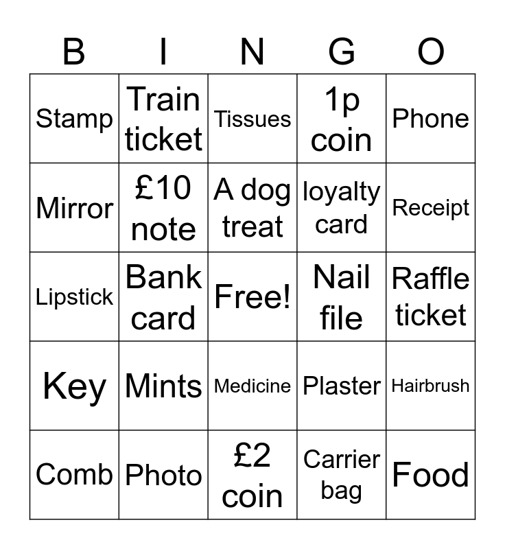 This bingo card has a free space and 29 words: Comb, Safety pin, Bank card, Trolley disk, Stamp, Tissues, £10 note, Mints, Nail file, Photo, Raffle ticket, Food, £2 coin, Carrier bag, Receipt, Diary, Medicine, Key, Phone, Lipstick, Plaster, Pen, loyalty card, Mirror, 1p coin, Train ticket, Hairbrush, A dog treat and Hair bobble/ hair grip.