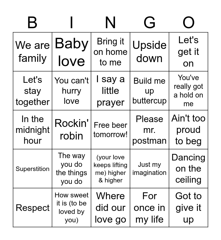 This bingo card has a free space and 34 words: I heard it through the grapevine, For once in my life, Dancing in the street, I want you back, Superstition, You can't hurry love, Let's get it on, Respect, Baby love, Being with you, I say a little prayer, Bring it on home to me, Hold on, I'm comin, ABC, Please mr. postman, You've really got a hold on me, How sweet it is (to be loved by you), In the midnight hour, The way you do the things you do, Just my imagination, (your love keeps lifting me) higher & higher, Stop! in the name of love, We are family, Ain't too proud to beg, Where did our love go, Got to give it up, Upside down, Give it to me baby, Build me up buttercup, Let's stay together, Sir duke, Rockin' robin, Dancing on the ceiling and Brick house.
