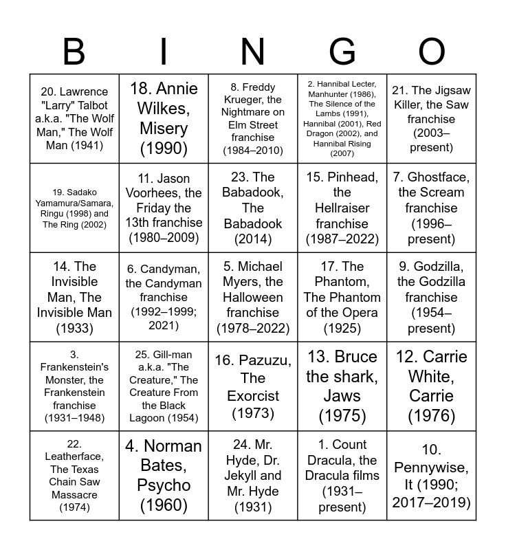 This bingo card has 25 words: 25. Gill-man a.k.a. "The Creature," The Creature From the Black Lagoon (1954), 24. Mr. Hyde, Dr. Jekyll and Mr. Hyde (1931), 23. The Babadook, The Babadook (2014), 22. Leatherface, The Texas Chain Saw Massacre (1974), 21. The Jigsaw Killer, the Saw franchise (2003–present), 20. Lawrence "Larry" Talbot a.k.a. "The Wolf Man," The Wolf Man (1941), 19. Sadako Yamamura/Samara, Ringu (1998) and The Ring (2002), 18. Annie Wilkes, Misery (1990), 17. The Phantom, The Phantom of the Opera (1925), 16. Pazuzu, The Exorcist (1973), 15. Pinhead, the Hellraiser franchise (1987–2022), 14. The Invisible Man, The Invisible Man (1933), 13. Bruce the shark, Jaws (1975), 12. Carrie White, Carrie (1976), 11. Jason Voorhees, the Friday the 13th franchise (1980–2009), 10. Pennywise, It (1990; 2017–2019), 9. Godzilla, the Godzilla franchise (1954–present), 8. Freddy Krueger, the Nightmare on Elm Street franchise (1984–2010), 7. Ghostface, the Scream franchise (1996–present), 6. Candyman, the Candyman franchise (1992–1999; 2021), 5. Michael Myers, the Halloween franchise (1978–2022), 4. Norman Bates, Psycho (1960), 3. Frankenstein's Monster, the Frankenstein franchise (1931–1948), 2. Hannibal Lecter, Manhunter (1986), The Silence of the Lambs (1991), Hannibal (2001), Red Dragon (2002), and Hannibal Rising (2007) and 1. Count Dracula, the Dracula films (1931–present).