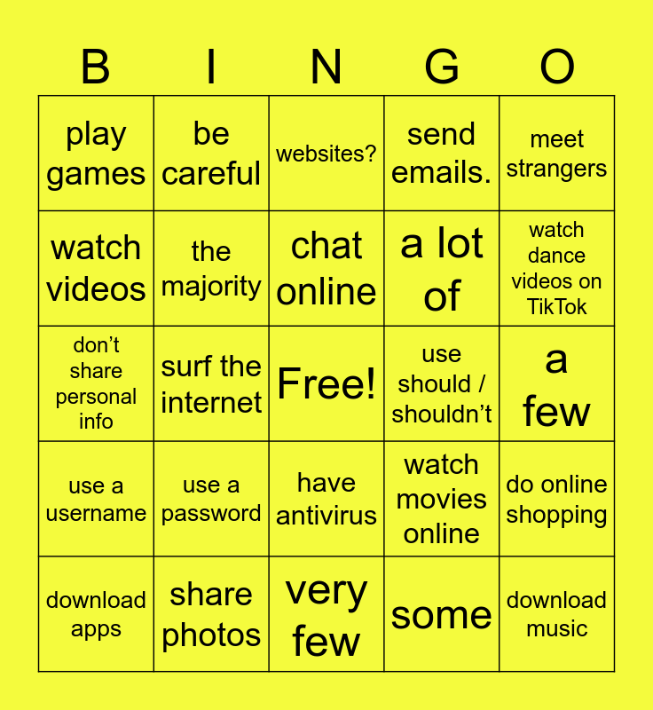 This bingo card has a free space and 24 words: use a password, share photos, chat online, download apps, meet strangers, play games, watch videos, be careful, use should / shouldn’t, have antivirus, a lot of, don’t share personal info, watch movies online, do online shopping, the majority, some, a few, websites?, watch dance videos on TikTok, surf the internet, download music, use a username, send emails. and very few.