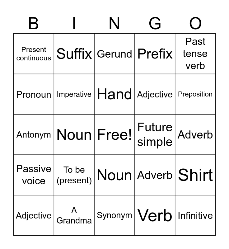 This bingo card has a free space and 29 words: Adjective, A hat, Noun, Infinitive, Present continuous, Gerund, Imperative, To be (present), Future simple, A Grandma, Adverb, Infinitive, Synonym, Verb, Preposition, A cat, Noun, Passive voice, Past tense verb, Antonym, Adverb, Past simple, Adjective, Pronoun, Prefix, Suffix, Shirt, Hand and Finger.