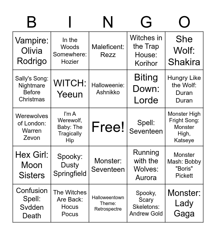This bingo card has a free space and 42 words: This Is Halloween: Nightmare Before Christmas, Halloweenie: Ashnikko, Rotten to the Core: Dove Cameron, Spooky: Dusty Springfield, Spooky, Scary Skeletons: Andrew Gold, Monster Mash: Bobby "Boris" Pickett, Monster: Lady Gaga, Frankenstein: Qvenn Herby, Maleficent: Rezz, Monster: Seventeen, Monster High Fright Song: Monster High, Katseye, Hungry Like the Wolf: Duran Duran, I'm A Werewolf, Baby: The Tragically Hip, She Wolf: Shakira, Wolf Bite: Owl City, Running with the Wolves: Aurora, Howl: Florence + The Machine, Werewolves of London: Warren Zevon, We Own the Night: Chandler Kinney, In the Woods Somewhere: Hozier, Sally's Song: Nightmare Before Christmas, The Hearse Song (The Worms Crawl In): Halloween Scream Team, Freak: Sub Urban, Vampire: Olivia Rodrigo, vampire diaries: mgk, Bite Me: Enhypen, Biting Down: Lorde, Teeth: 5 Seconds of Summer, Dracula: Tame Impala, The Addams Family: The Addams Family, Oogie Boogie's Song: Nightmare Before Christmas, Hex Girl: Moon Sisters, WITCH: Yeeun, Halloweentown Theme: Retrospectre, Witchcraft: Frank Sinatra, Confusion Spell: Svdden Death, The Witches Are Back: Hocus Pocus, Spell: Seventeen, Season Of The Witch: Lana Del Rey, Come Little Children: Hocus Pocus, Witches in the Trap House: Korihor and Witch Circle: Leave.