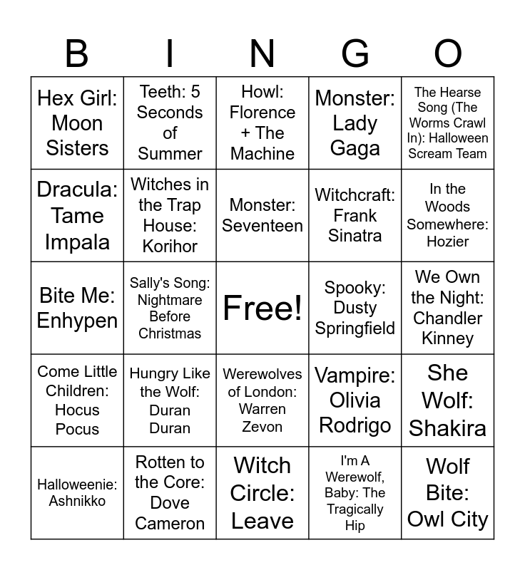 This bingo card has a free space and 42 words: Maleficent: Rezz, Monster: Seventeen, Monster High Fright Song: Monster High, Katseye, Hungry Like the Wolf: Duran Duran, I'm A Werewolf, Baby: The Tragically Hip, She Wolf: Shakira, Wolf Bite: Owl City, Running with the Wolves: Aurora, Howl: Florence + The Machine, Werewolves of London: Warren Zevon, We Own the Night: Chandler Kinney, In the Woods Somewhere: Hozier, Sally's Song: Nightmare Before Christmas, The Hearse Song (The Worms Crawl In): Halloween Scream Team, Freak: Sub Urban, Vampire: Olivia Rodrigo, vampire diaries: mgk, Bite Me: Enhypen, Biting Down: Lorde, Teeth: 5 Seconds of Summer, Dracula: Tame Impala, The Addams Family: The Addams Family, Oogie Boogie's Song: Nightmare Before Christmas, Hex Girl: Moon Sisters, WITCH: Yeeun, Halloweentown Theme: Retrospectre, Witchcraft: Frank Sinatra, Confusion Spell: Svdden Death, The Witches Are Back: Hocus Pocus, Spell: Seventeen, Season Of The Witch: Lana Del Rey, Come Little Children: Hocus Pocus, Witches in the Trap House: Korihor, Witch Circle: Leave, This Is Halloween: Nightmare Before Christmas, Halloweenie: Ashnikko, Rotten to the Core: Dove Cameron, Spooky: Dusty Springfield, Spooky, Scary Skeletons: Andrew Gold, Monster Mash: Bobby "Boris" Pickett, Monster: Lady Gaga and Frankenstein: Qvenn Herby.