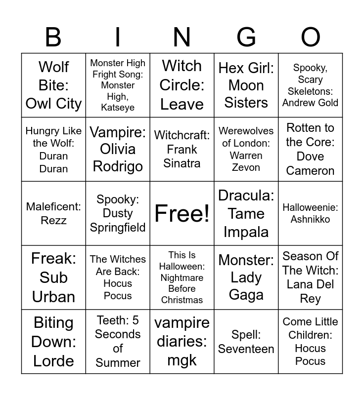 This bingo card has a free space and 42 words: Halloweentown Theme: Retrospectre, Witchcraft: Frank Sinatra, Confusion Spell: Svdden Death, The Witches Are Back: Hocus Pocus, Spell: Seventeen, Season Of The Witch: Lana Del Rey, Come Little Children: Hocus Pocus, Witches in the Trap House: Korihor, Witch Circle: Leave, This Is Halloween: Nightmare Before Christmas, Halloweenie: Ashnikko, Rotten to the Core: Dove Cameron, Spooky: Dusty Springfield, Spooky, Scary Skeletons: Andrew Gold, Monster Mash: Bobby "Boris" Pickett, Monster: Lady Gaga, Frankenstein: Qvenn Herby, Maleficent: Rezz, Monster: Seventeen, Monster High Fright Song: Monster High, Katseye, Hungry Like the Wolf: Duran Duran, I'm A Werewolf, Baby: The Tragically Hip, She Wolf: Shakira, Wolf Bite: Owl City, Running with the Wolves: Aurora, Howl: Florence + The Machine, Werewolves of London: Warren Zevon, We Own the Night: Chandler Kinney, In the Woods Somewhere: Hozier, Sally's Song: Nightmare Before Christmas, The Hearse Song (The Worms Crawl In): Halloween Scream Team, Freak: Sub Urban, Vampire: Olivia Rodrigo, vampire diaries: mgk, Bite Me: Enhypen, Biting Down: Lorde, Teeth: 5 Seconds of Summer, Dracula: Tame Impala, The Addams Family: The Addams Family, Oogie Boogie's Song: Nightmare Before Christmas, Hex Girl: Moon Sisters and WITCH: Yeeun.