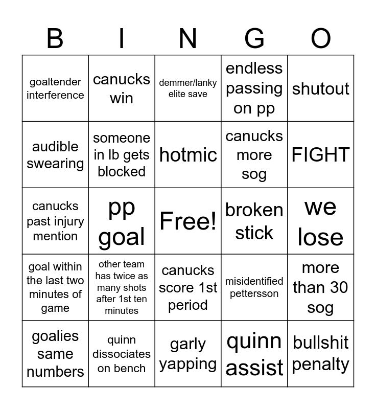 This bingo card has a free space and 43 words: did you really think you could get away with that (obvious penalty), bullshit penalty, refs miss obvious penalty, goalies same numbers, bald coach, quinn assist, demmer/lanky elite save, overtime, shutout, quinn dissociates on bench, endless passing on pp, broken stick, canucks score 1st period, other team has twice as many shots after 1st ten minutes, canucks give up first goal, garly yapping, weirdly sexual sports commentary, canucks past injury mention, someone causing problems on purpose, FIGHT, canucks win, wounded canuck, broadcasters non-game related yapping, goaltender interference, quinn hughes glazing, we lose, someone on the other team has the same name as a canuck, sog within the first minute, misidentified pettersson, goal within the last two minutes of game, time out is called, more than 30 sog, 0-0 after first period, pp goal, we get scored on during pp, shorty-isms, rookie/abby canuck goal, hotmic, audible swearing, canucks more sog, lb: let’s kill ourselves, someone in lb gets blocked and announcer butchers the pronunciation of a name.