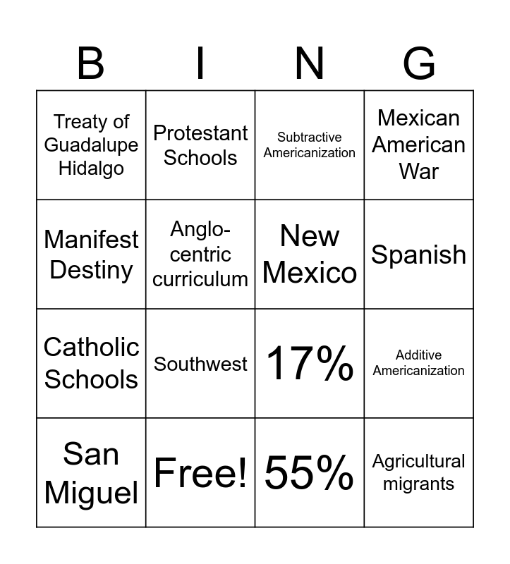 This bingo card has 16 words: Free!, Additive Americanization, Subtractive Americanization, Treaty of Guadalupe Hidalgo, Catholic Schools, Protestant Schools, 17%, 55%, Manifest Destiny, Anglo-centric curriculum, San Miguel, Mexican American War, Southwest, Spanish, New Mexico and Agricultural migrants.