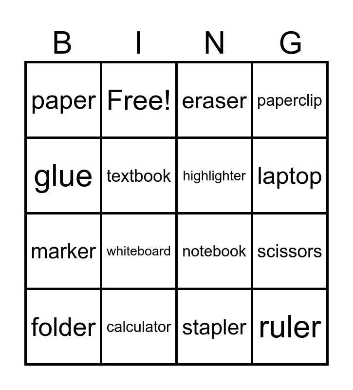 This bingo card has 19 words: notebook, pencil, eraser, ruler, scissors, glue, stapler, paper, Free!, marker, whiteboard, textbook, highlighter, calculator, folder, binder, paperclip, laptop and tape.