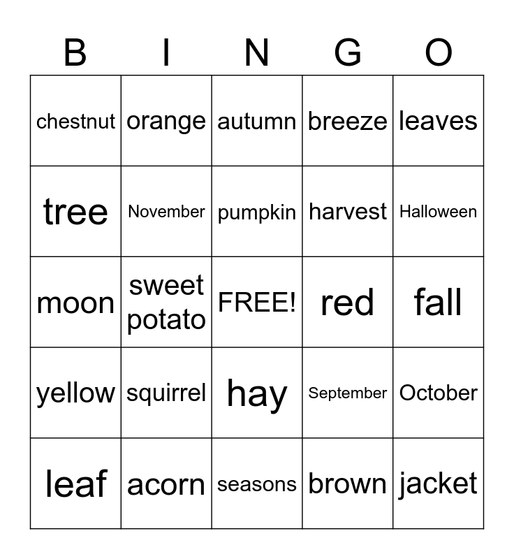 This bingo card has a free space and 24 words: squirrel, acorn, pumpkin, leaf, leaves, chestnut, tree, orange, red, hay, harvest, moon, September, October, November, brown, fall, autumn, Halloween, sweet potato, jacket, yellow, breeze and seasons.