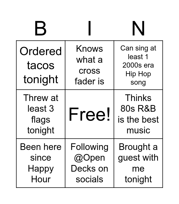 This bingo card has a free space and 8 words: Thinks 80s R&B is the best music, Can sing at least 1 2000s era Hip Hop song, Knows what a cross fader is, Been here since Happy Hour, Ordered tacos tonight, Brought a guest with me tonight, Threw at least 3 flags tonight and Following @Open Decks on socials.