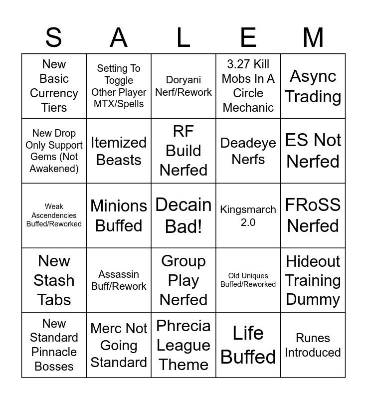This bingo card has a free space and 24 words: Assassin Buff/Rework, Merc Not Going Standard, RF Build Nerfed, New Standard Pinnacle Bosses, Async Trading, New Basic Currency Tiers, New Drop Only Support Gems (Not Awakened), Setting To Toggle Other Player MTX/Spells, Kingsmarch 2.0, Group Play Nerfed, Deadeye Nerfs, Weak Ascendencies Buffed/Reworked, Old Uniques Buffed/Reworked, Hideout Training Dummy, Itemized Beasts, Life Buffed, FRoSS Nerfed, Doryani Nerf/Rework, ES Not Nerfed, Minions Buffed, Runes Introduced, New Stash Tabs, 3.27 Kill Mobs In A Circle Mechanic and Phrecia League Theme.