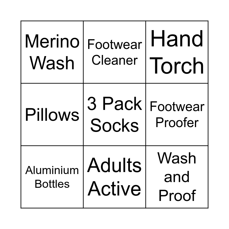This bingo card has a free space and 25 words: Adults Merino Socks, Kids Merino Socks, Adults Active, 3 Pack Socks, Wash and Proof, Merino Wash, Footwear Proofer, Footwear Cleaner, Dubbin, Leather Suede Proof, Tent Proofer, Small Rucksack, Large Bottles, Medium Bottles, Aluminium Bottles, Kids Bottles, Head Torch, Hand Torch, Magnetic Torch, Caps, NZ Cap, Towels, Packaway Bags, Pillows and Umbrellas.