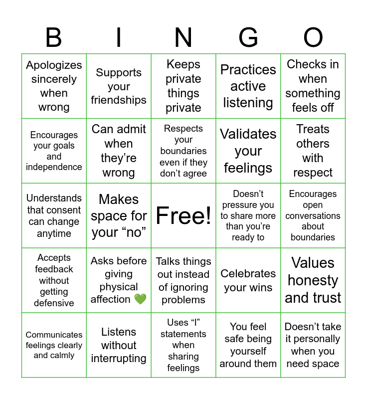 This bingo card has a free space and 24 words: Asks before giving physical affection 💚, Listens without interrupting, Respects your boundaries even if they don’t agree, Communicates feelings clearly and calmly, Checks in when something feels off, Apologizes sincerely when wrong, Encourages your goals and independence, Supports your friendships, Doesn’t pressure you to share more than you’re ready to, Talks things out instead of ignoring problems, Validates your feelings, Understands that consent can change anytime, Celebrates your wins, Values honesty and trust, Can admit when they’re wrong, You feel safe being yourself around them, Encourages open conversations about boundaries, Keeps private things private, Treats others with respect, Makes space for your “no”, Doesn’t take it personally when you need space, Accepts feedback without getting defensive, Practices active listening and Uses “I” statements when sharing feelings.