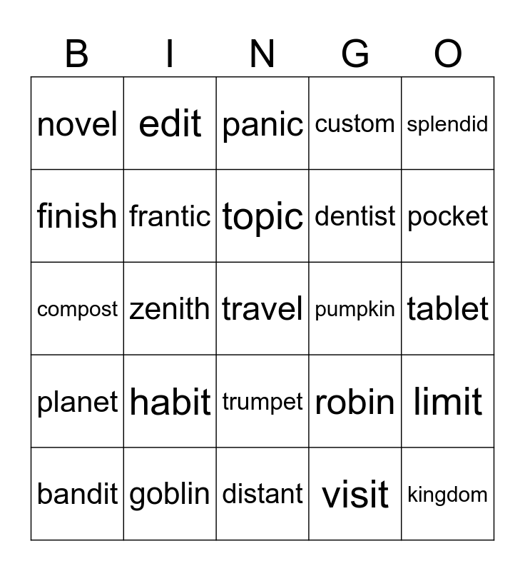 This bingo card has a free space and 24 words: habit, goblin, topic, bandit, splendid, novel, finish, edit, pumpkin, trumpet, dentist, compost, robin, limit, frantic, visit, tablet, panic, pocket, zenith, kingdom, planet, custom and distant.