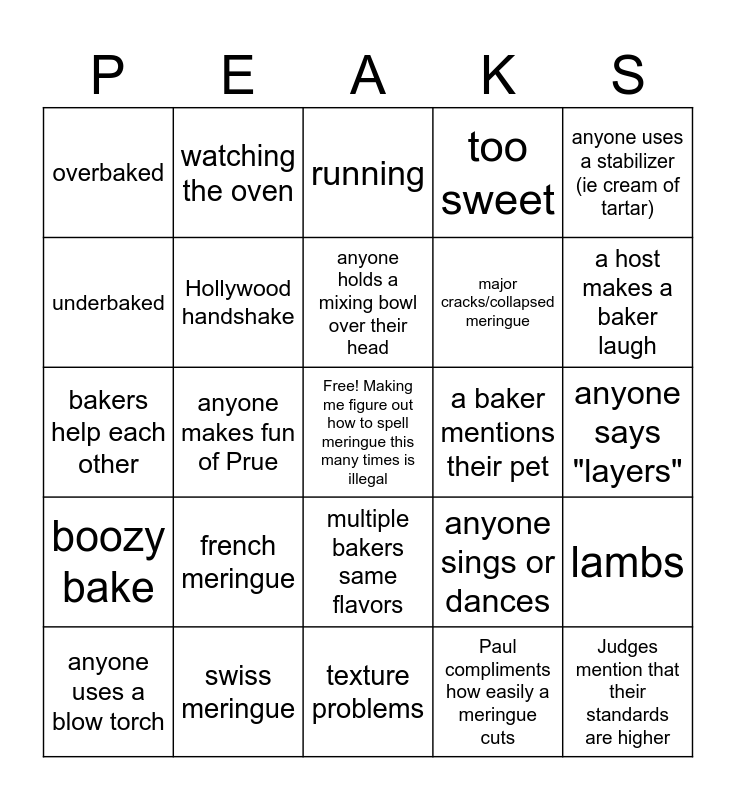 This bingo card has a free space and 24 words: french meringue, swiss meringue, anyone holds a mixing bowl over their head, anyone uses a blow torch, anyone uses a stabilizer (ie cream of tartar), overbaked, underbaked, watching the oven, a baker mentions their pet, multiple bakers same flavors, major cracks/collapsed meringue, bakers help each other, anyone sings or dances, lambs, Hollywood handshake, Paul compliments how easily a meringue cuts, anyone says "layers", running, a host makes a baker laugh, anyone makes fun of Prue, Judges mention that their standards are higher, boozy bake, too sweet and texture problems.