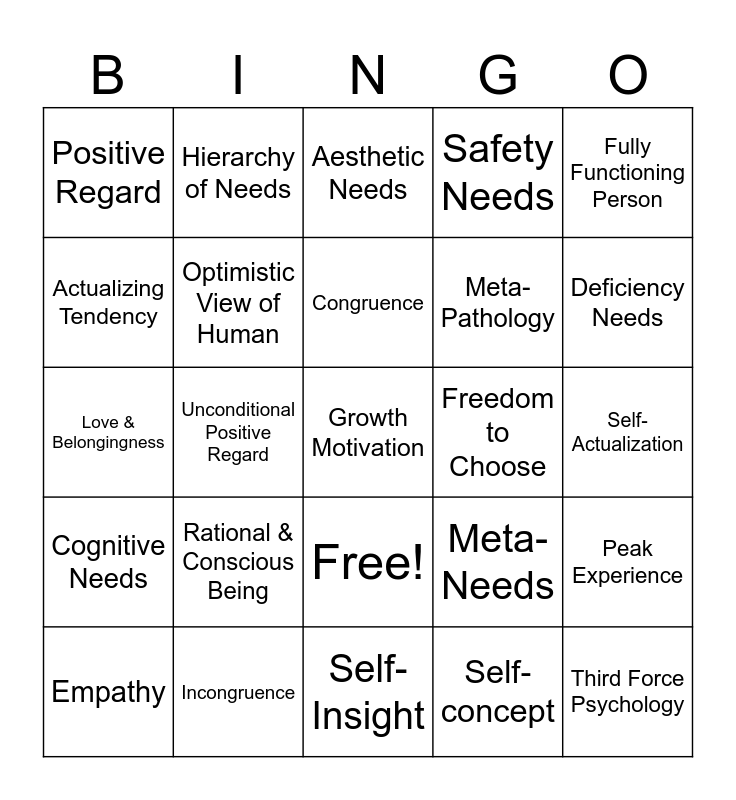 This bingo card has 26 words: Free!, Self-concept, Congruence, Incongruence, Fully Functioning Person, Positive Regard, Actualizing Tendency, Hierarchy of Needs, Self-Actualization, Meta-Needs, Meta-Pathology, Love & Belongingness, Peak Experience, Empathy, Unconditional Positive Regard, Organism, Safety Needs, Cognitive Needs, Aesthetic Needs, Growth Motivation, Deficiency Needs, Self-Insight, Freedom to Choose, Rational & Conscious Being, Optimistic View of Human and Third Force Psychology.