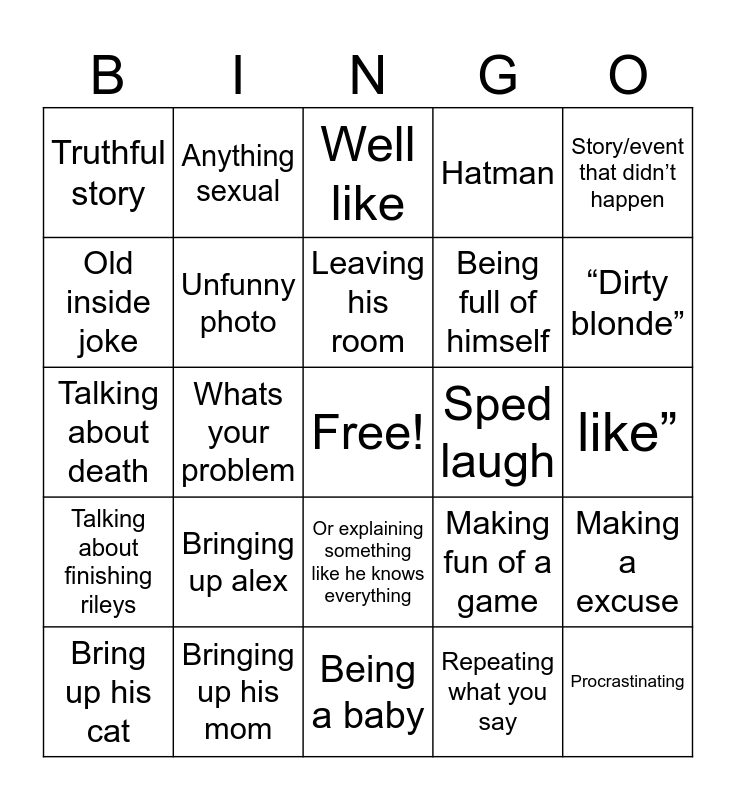 This bingo card has a free space and 24 words: Bringing up alex, Bringing up his mom, Leaving his room, Bring up his cat, Story/event that didn’t happen, Truthful story, Old inside joke, Anything sexual, Sped laugh, Or explaining something like he knows everything, Being full of himself, Talking about death, Making fun of a game, Making a excuse, Unfunny photo, Repeating what you say, like”, Well like, “Dirty blonde”, Whats your problem, Procrastinating, Talking about finishing rileys, Hatman and Being a baby.