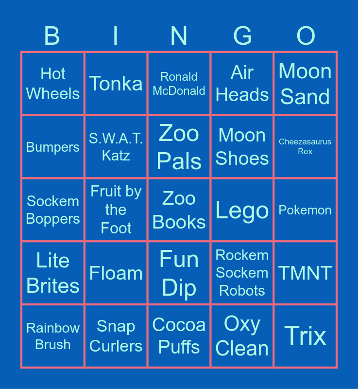 This bingo card has a free space and 24 words: Floam, Snap Curlers, Zoo Pals, Rainbow Brush, Moon Sand, Hot Wheels, Bumpers, Tonka, Lego, Fun Dip, Moon Shoes, Sockem Boppers, Rockem Sockem Robots, TMNT, S.W.A.T. Katz, Oxy Clean, Pokemon, Ronald McDonald, Cheezasaurus Rex, Fruit by the Foot, Trix, Lite Brites, Air Heads and Cocoa Puffs.