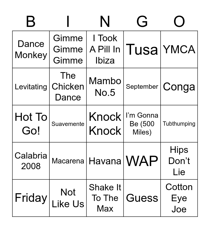This bingo card has 32 words: Guess, Traag, Suavemente, Cha Cha Slide, Calabria 2008, The Chicken Dance, YMCA, Hips Don’t Lie, Gimme Gimme Gimme, Cotton Eye Joe, Mambo No.5, I Took A Pill In Ibiza, Alors On Danse, The Ketchup Song, I’m Gonna Be (500 Miles), Born Again, Friday, Hot To Go!, Havana, Macarena, WAP, Hot Hot Hot, Tubthumping, Not Like Us, Knock Knock, Tusa, September, Levitating, Dance Monkey, Shake It To The Max, Murder On The DanceFloor and Conga.