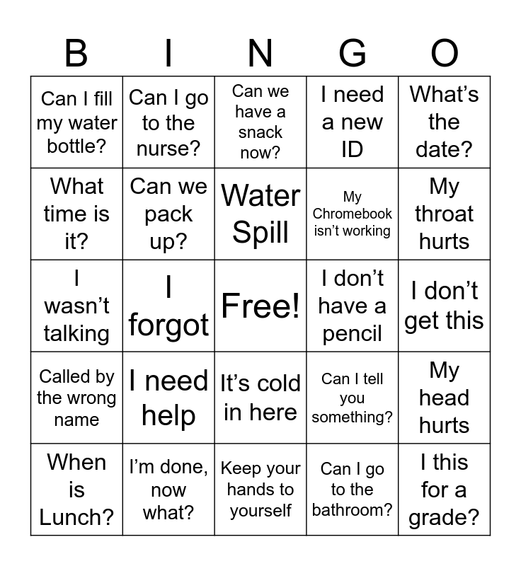 This bingo card has a free space and 24 words: I need help, I’m done, now what?, Water Spill, When is Lunch?, What’s the date?, Can I fill my water bottle?, What time is it?, Can I go to the nurse?, I don’t have a pencil, It’s cold in here, My Chromebook isn’t working, I wasn’t talking, Can I tell you something?, My head hurts, Can we pack up?, Can I go to the bathroom?, I don’t get this, Can we have a snack now?, My throat hurts, I forgot, I this for a grade?, Called by the wrong name, I need a new ID and Keep your hands to yourself.