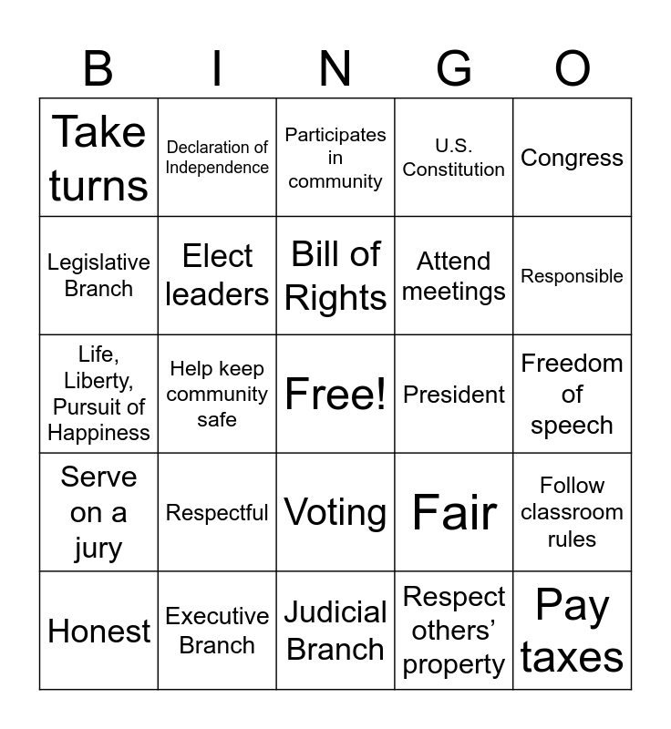 This bingo card has a free space and 25 words: Legislative Branch, Executive Branch, Judicial Branch, President, Congress, Declaration of Independence, Bill of Rights, U.S. Constitution, Freedom of speech, Life, Liberty, Pursuit of Happiness, Voting, Attend meetings, Pay taxes, Serve on a jury, Elect leaders, Respect others’ property, Follow classroom rules, Take turns, Help keep community safe, Safety rules, Responsible, Honest, Respectful, Participates in community and Fair.