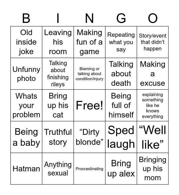 This bingo card has a free space and 24 words: Truthful story, Anything sexual, Blaming or talking about condition/injury, Hatman, Story/event that didn’t happen, Old inside joke, Unfunny photo, Leaving his room, Being full of himself, “Dirty blonde”, Talking about death, Whats your problem, Sped laugh, “Well like”, Talking about finishing rileys, Bring up alex, explaining something like he knows everything, Making fun of a game, Making a excuse, Bring up his cat, Bringing up his mom, Being a baby, Repeating what you say and Procrastinating.