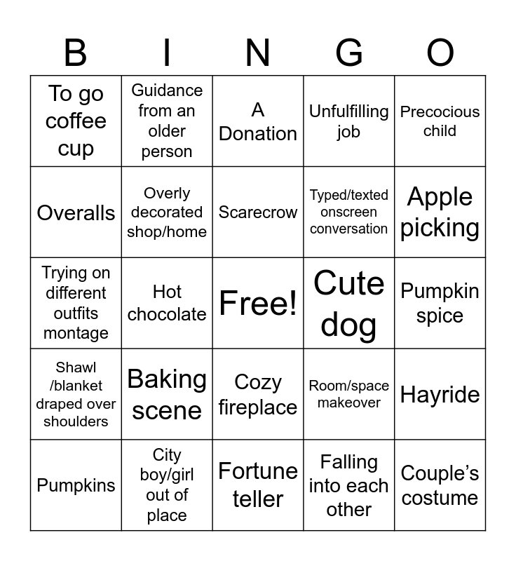 This bingo card has a free space and 29 words: Pumpkins, Coffee shop, Hot chocolate, Failing business, To go coffee cup, A Donation, Overly decorated shop/home, Baking scene, Cute dog, City boy/girl out of place, Pumpkin spice, Couple’s costume, Fortune teller, Falling into each other, Apple picking, Pile of leaves, Cozy fireplace, Shawl /blanket draped over shoulders, Precocious child, Trying on different outfits montage, Room/space makeover, Overly involved best friend, Typed/texted onscreen conversation, Overalls, Unfulfilling job, Guidance from an older person, Hayride, Scarecrow and A special event with dancing.