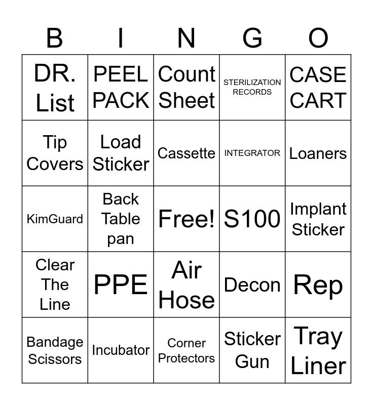 This bingo card has a free space and 24 words: PPE, Incubator, Cassette, Bandage Scissors, CASE CART, DR. List, Tip Covers, PEEL PACK, S100, Air Hose, INTEGRATOR, KimGuard, Decon, Rep, Load Sticker, Sticker Gun, Implant Sticker, Count Sheet, Loaners, Back Table pan, Tray Liner, Clear The Line, STERILIZATION RECORDS and Corner Protectors.
