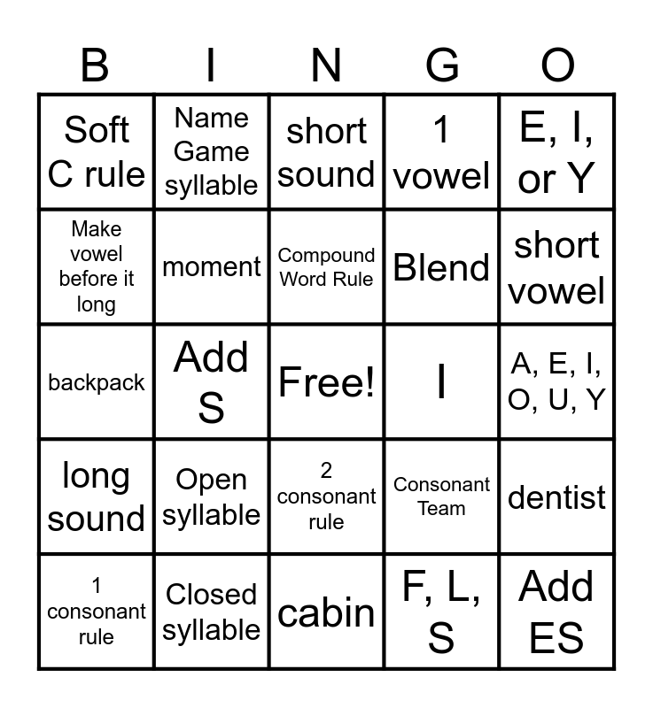 This bingo card has a free space and 24 words: Open syllable, Closed syllable, Compound Word Rule, 1 consonant rule, E, I, or Y, Soft C rule, Make vowel before it long, Name Game syllable, I, 2 consonant rule, Blend, backpack, Consonant Team, dentist, moment, F, L, S, A, E, I, O, U, Y, short sound, short vowel, Add S, Add ES, long sound, 1 vowel and cabin.