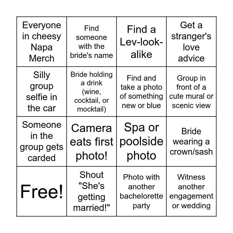 This bingo card has 16 words: Shout "She's getting married!", Bride wearing a crown/sash, Find a Lev-look-alike, Everyone in cheesy Napa Merch, Someone in the group gets carded, Find someone with the bride's name, Spa or poolside photo, Photo with another bachelorette party, Silly group selfie in the car, Bride holding a drink (wine, cocktail, or mocktail), Free!, Get a stranger's love advice, Camera eats first photo!, Group in front of a cute mural or scenic view, Find and take a photo of something new or blue and Witness another engagement or wedding.