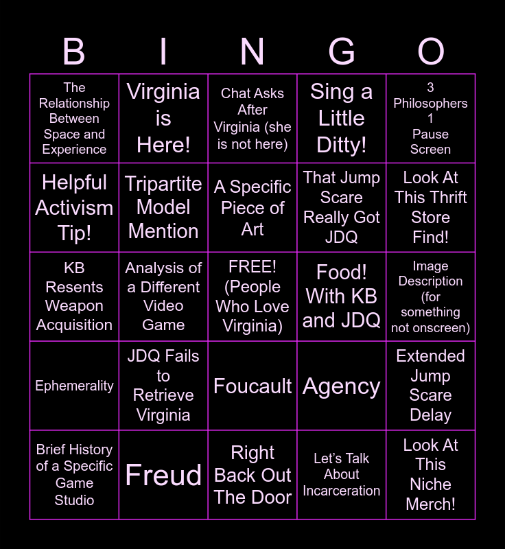 This bingo card has a free space and 26 words: Foucault, Let’s Talk About Incarceration, A Specific Piece of Art, Freud, 3 Philosophers 1 Pause Screen, The Relationship Between Space and Experience, Helpful Activism Tip!, Virginia is Here!, Image Description (for something not onscreen), Agency, That Jump Scare Really Got JDQ, KB Resents Weapon Acquisition, Extended Jump Scare Delay, Brief History of a Specific Game Studio, Analysis of a Different Video Game, A Bit From a Previous Recording Comes Back, Sing a Little Ditty!, Ephemerality, Chat Asks After Virginia (she is not here), Look At This Niche Merch!, Look At This Thrift Store Find!, Right Back Out The Door, Food! With KB and JDQ, JDQ Fails to Retrieve Virginia, Tripartite Model Mention and New Instrument! Makes Fun Noises!.