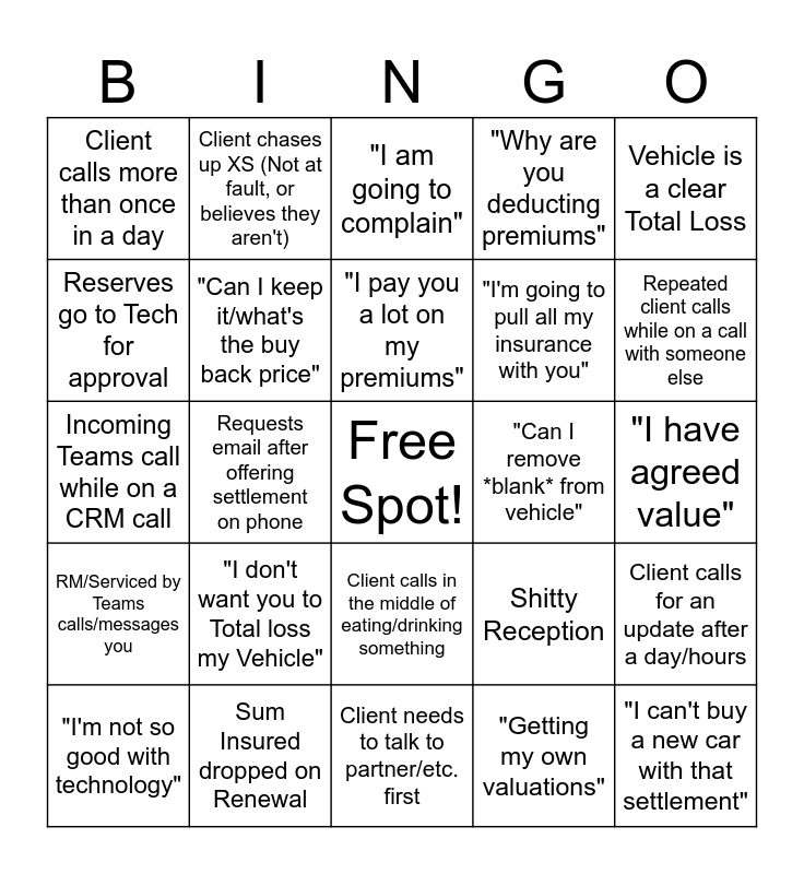 This bingo card has a free space and 24 words: "I don't want you to Total loss my Vehicle", Sum Insured dropped on Renewal, "I pay you a lot on my premiums", "I'm not so good with technology", Vehicle is a clear Total Loss, Client calls more than once in a day, Reserves go to Tech for approval, Client chases up XS (Not at fault, or believes they aren't), "Can I remove *blank* from vehicle", Client calls in the middle of eating/drinking something, "I'm going to pull all my insurance with you", Incoming Teams call while on a CRM call, Shitty Reception, Client calls for an update after a day/hours, "Can I keep it/what's the buy back price", "Getting my own valuations", "I have agreed value", "I am going to complain", Repeated client calls while on a call with someone else, Requests email after offering settlement on phone, "I can't buy a new car with that settlement", RM/Serviced by Teams calls/messages you, "Why are you deducting premiums" and Client needs to talk to partner/etc. first.