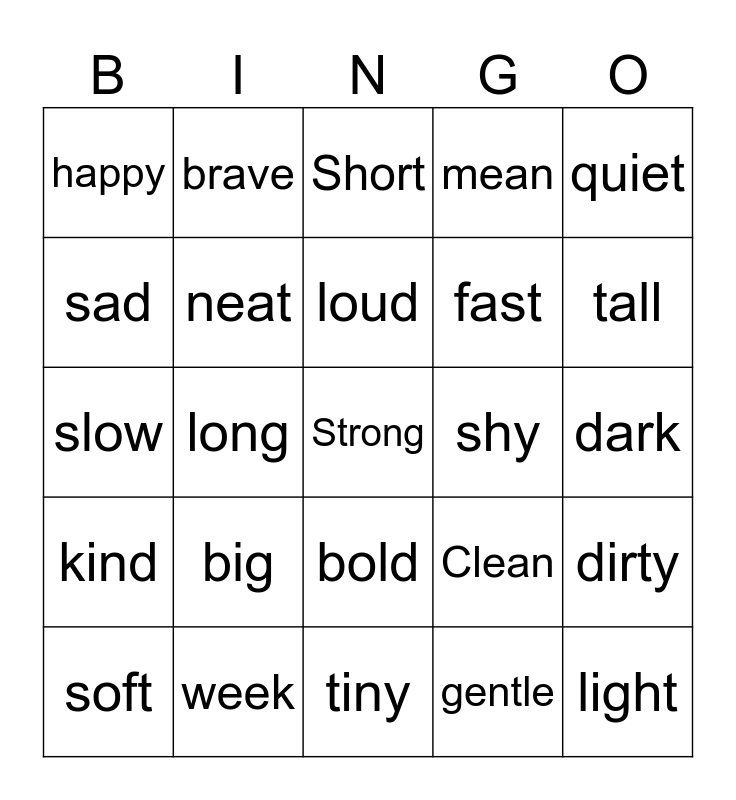 This bingo card has 25 words: big, tiny, loud, soft, quiet, happy, sad, brave, shy, bold, fast, slow, Clean, dirty, neat, light, dark, Short, tall, long, Strong, week, kind, mean and gentle.