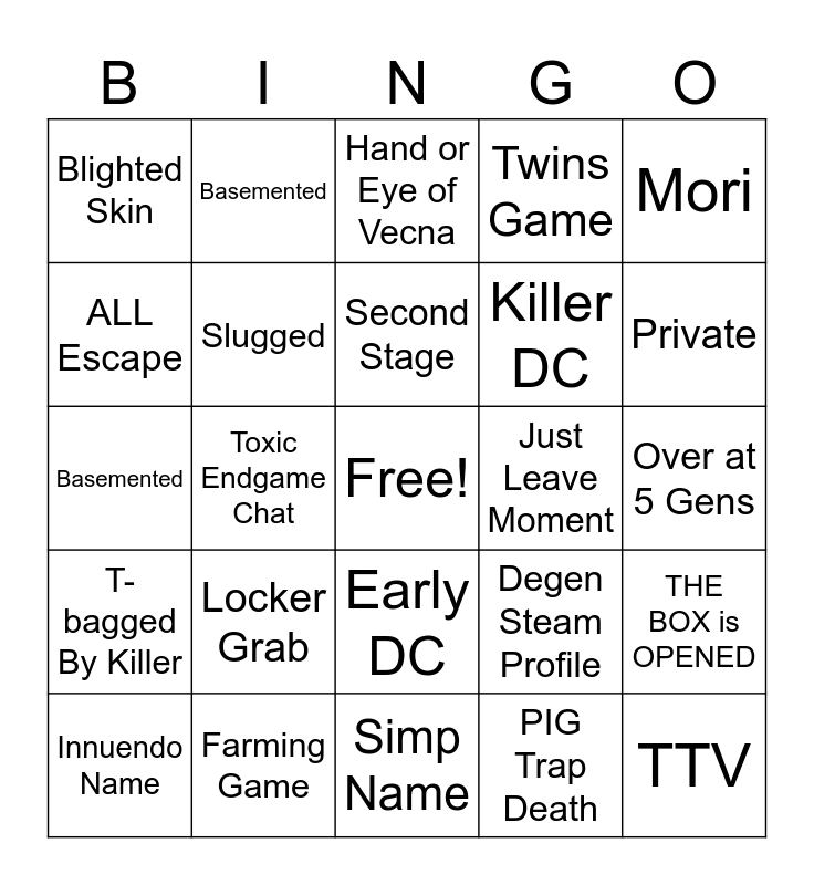 This bingo card has a free space and 40 words: NOED, Basemented, Tunneled Out, Slugged, Farming Game, Early DC, Second Stage, All 5 BP Offerings, Mori, T-bagged By Killer, Toxic Endgame Chat, Twins Game, TTV, Over at 5 Gens, Just Leave Moment, Locker Grab, Oops all Hexes, Blighted Skin, Mathew Lillard, Hand or Eye of Vecna, THE BOX is OPENED, PIG Trap Death, Killer DC, ALL Escape, Double Iri Killer, Map Offering, Adept Killer or Rando, Survivor BM, Lightborn, Back to Back Killer, Mercy Killer, Innuendo Name, Hex: or Boon: Name, Degen Steam Profile, Private, Simp Name, No META Randos, Old Mikey, Basemented and Edged Unhook.